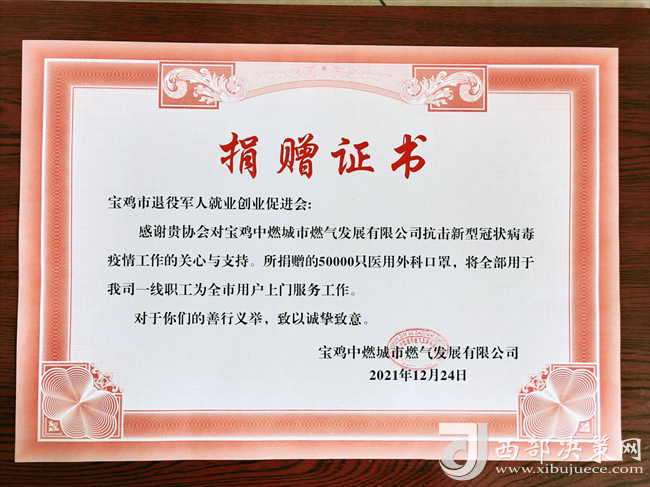 西部決策網(wǎng)訊 (任書(shū)彥)12月24日,寶雞市退役軍人就業(yè)創(chuàng)業(yè)促進(jìn)會(huì)向?qū)氹u中燃城市燃?xì)獍l(fā)展有限公司無(wú)償捐贈(zèng)醫(yī)用外科口罩50000只,以全力支持寶雞市抗疫防疫工作。