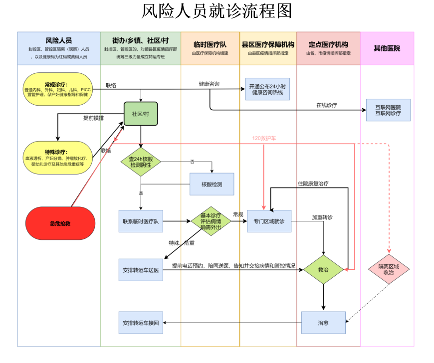 有急診搶救醫(yī)療需求的風(fēng)險(xiǎn)人員,直接撥打120急救電話,同時(shí)通知社區(qū)(村)工作人員對(duì)接120救護(hù)車、填寫(xiě)人員交接單,由120救護(hù)車聯(lián)系風(fēng)險(xiǎn)人員醫(yī)療保障醫(yī)療機(jī)構(gòu)、定點(diǎn)醫(yī)療機(jī)構(gòu),或就近送至具備相應(yīng)診療能力的醫(yī)療機(jī)構(gòu)。診療結(jié)束后,醫(yī)療機(jī)構(gòu)聯(lián)系社區(qū)(村)由縣區(qū)轉(zhuǎn)運(yùn)專班“點(diǎn)對(duì)點(diǎn)”接回。