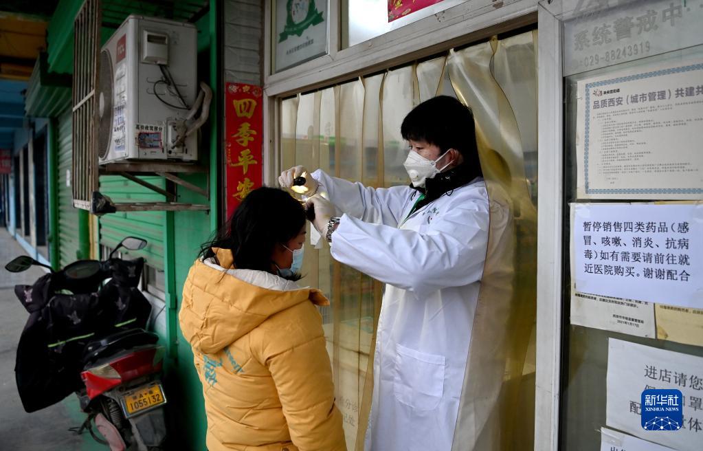 1月7日,西安市未央?yún)^(qū)西唐寨村一家藥店的負(fù)責(zé)人韓春陽在為村民看診。疫情發(fā)生后,藥店一直沒有關(guān)門,韓春陽每天會接到六七個線上線下的咨詢,下班后還會給鄰近村子的村民送藥。