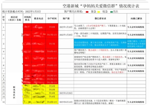 “人命關(guān)天,要趕緊把孕婦的底數(shù)摸清,她們住哪里、電話多少,同時(shí)也要想辦法把現(xiàn)有的醫(yī)生和孕婦‘連起來’,把專業(yè)的事情交給專業(yè)的人來解決。”據(jù)空港新城黨委組織部部長葛峰介紹,2021年12月31日早上,在了解到陽光里社區(qū)有孕婦需要去醫(yī)院進(jìn)行檢查和分娩的需求后,當(dāng)天下午4點(diǎn)多,社區(qū)黨支部書記殷振建就迅速將22名孕婦的相關(guān)情況及時(shí)上報(bào)給組織部,并由專人對群里孕媽媽們的訴求進(jìn)行實(shí)時(shí)統(tǒng)計(jì)。