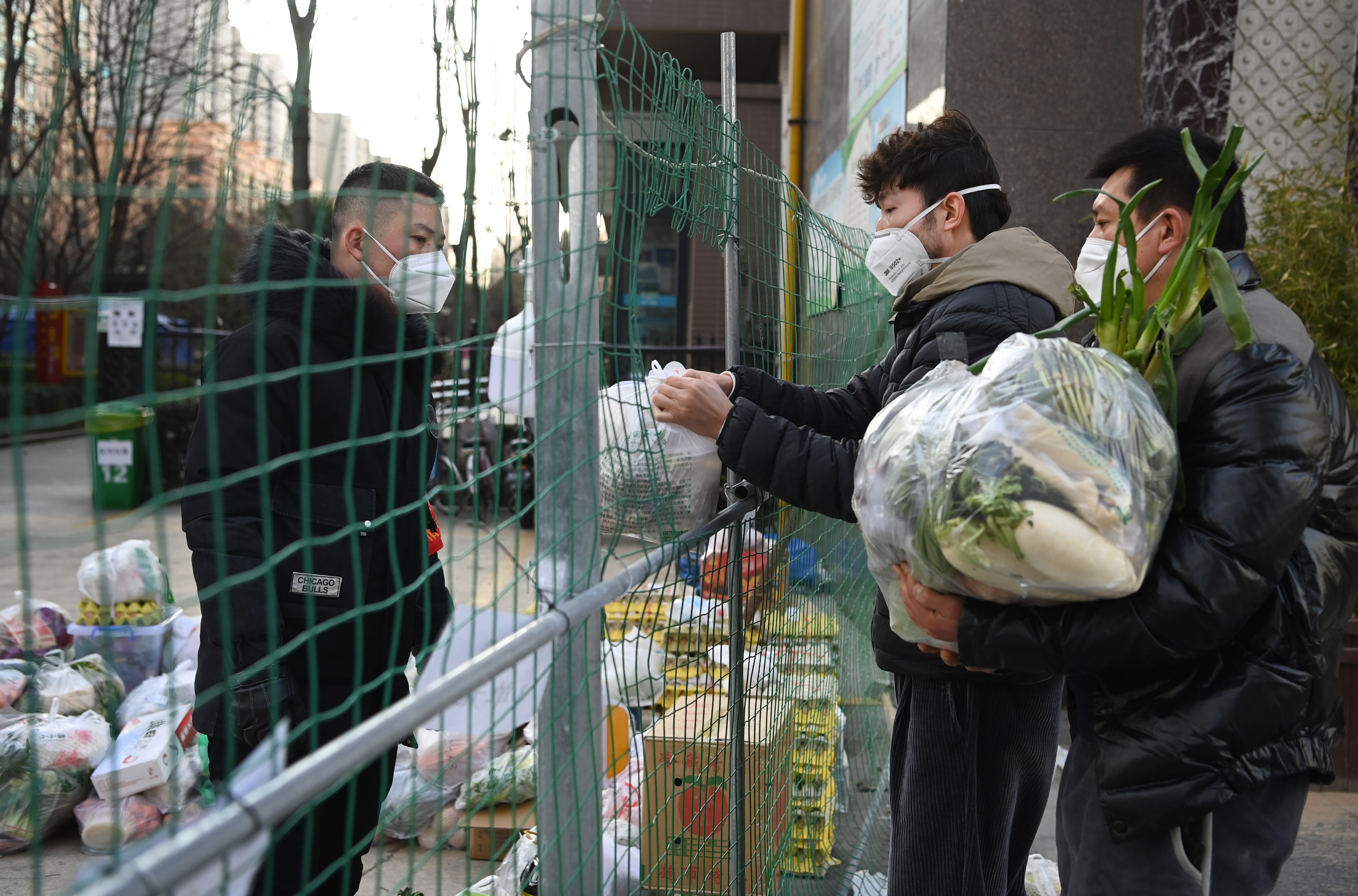 1月12日,志愿者(左)在社區(qū)門(mén)前小廣場(chǎng)接收居民線上購(gòu)買(mǎi)的生活物資。新華社記者 陶明 攝