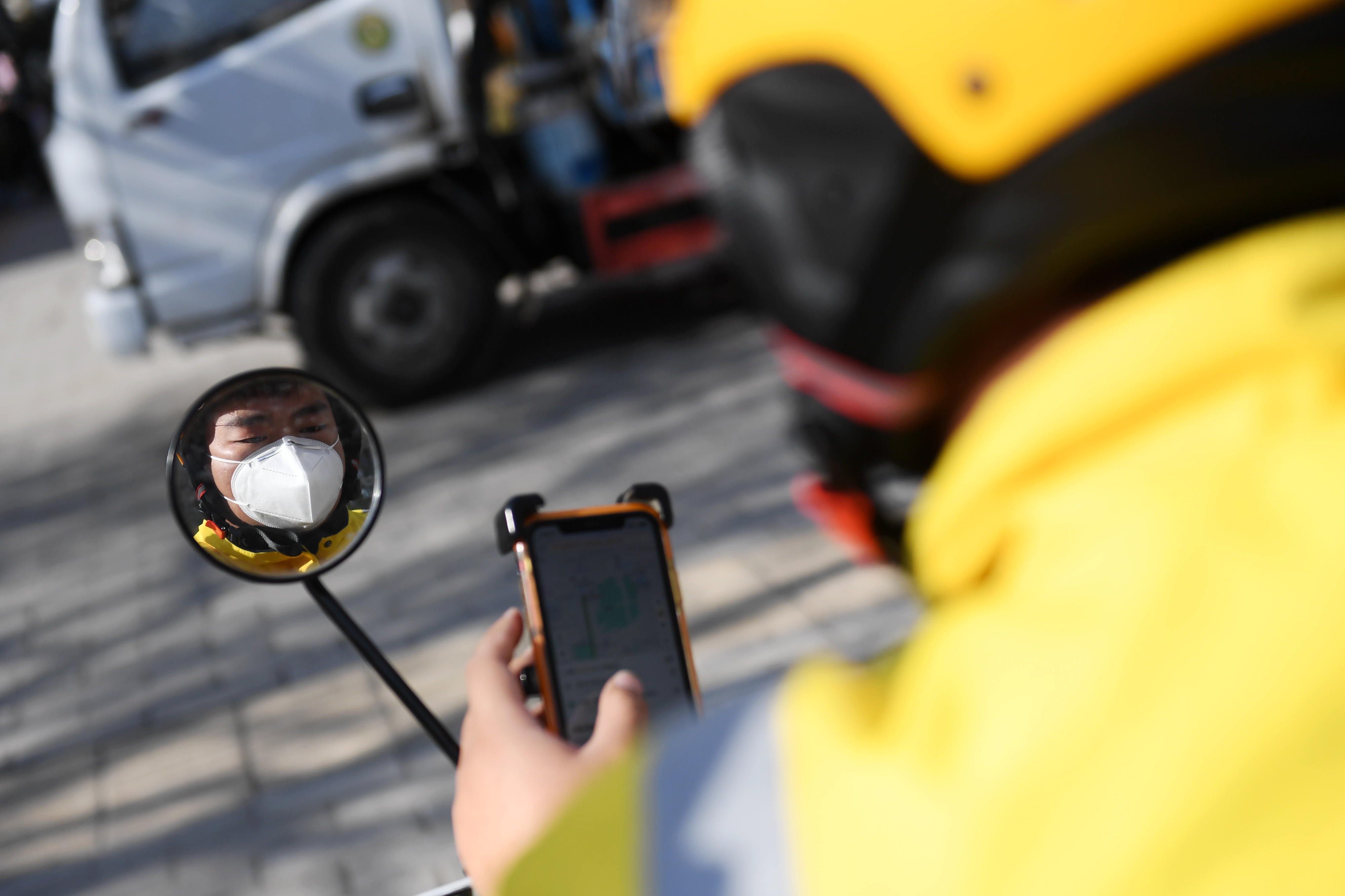 外賣騎手孔維建在西安市一家烘焙店取貨后準(zhǔn)備派送。新華社記者 李一博 攝