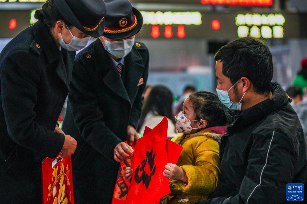 1月17日,貴陽客運(yùn)段工作人員在貴陽火車站為候車旅客送上福字與春聯(lián)。新華社記者 陶亮 攝