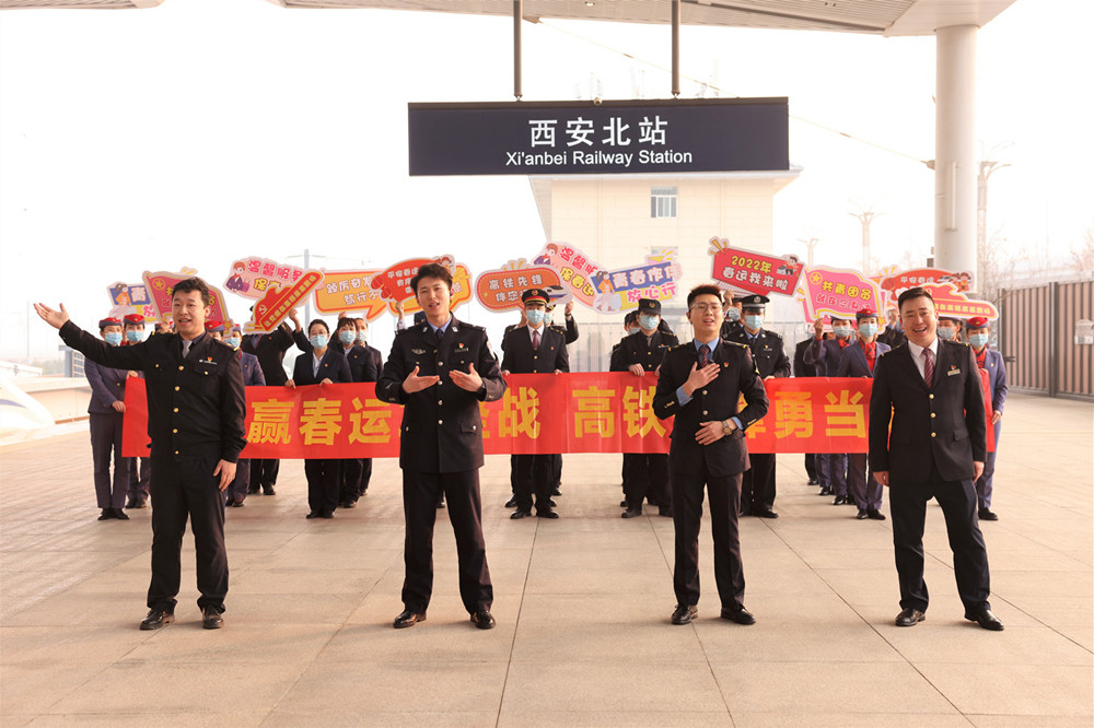 1月17日,來(lái)自中國(guó)鐵路西安局集團(tuán)有限公司黨團(tuán)員代表,在西安北站演唱西鐵版《西安人的歌》。