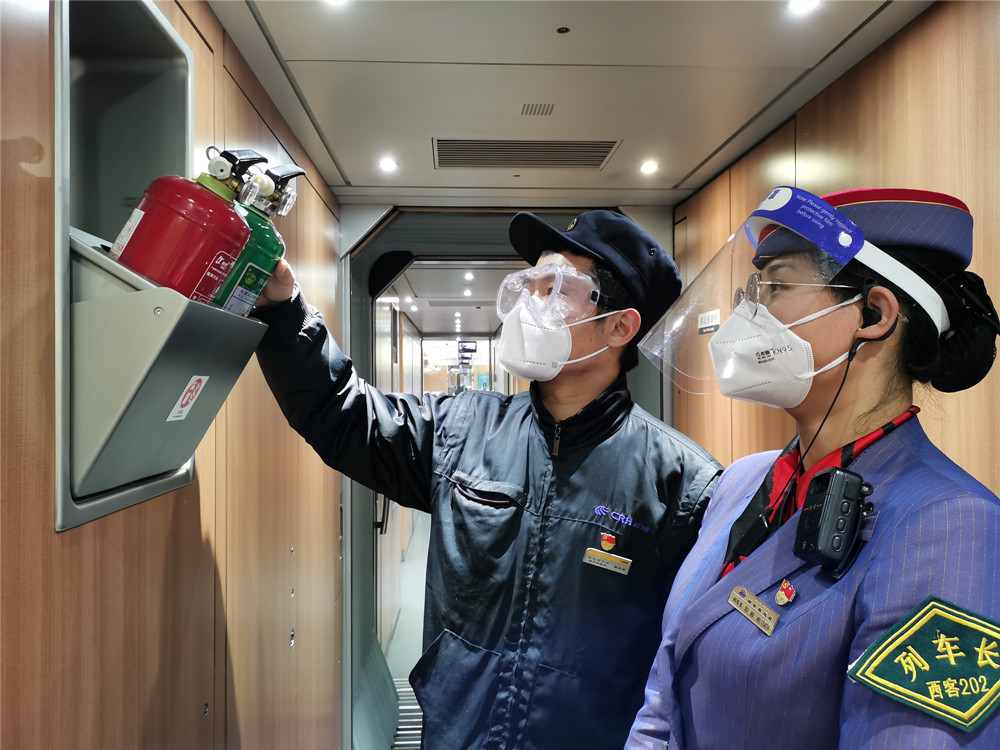西安“高鐵先鋒”檢查車(chē)內(nèi)消防設(shè)備。