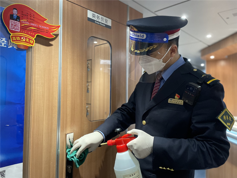 西安“高鐵先鋒”給車(chē)內(nèi)公共區(qū)域消毒。