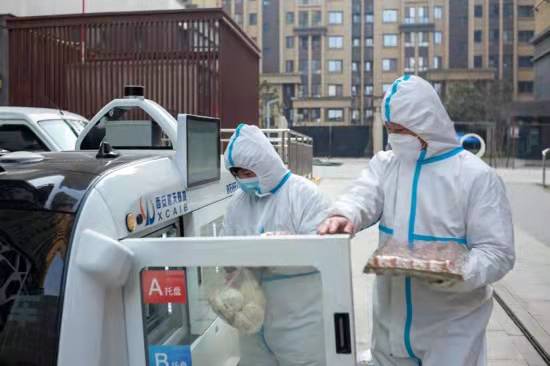 關(guān)好柜門后,白色小車便沿著設(shè)定軌道緩緩駛向附近的鳳鳴小區(qū)。穿著防護(hù)服的工作人員早已等候在指定位置,他們打開寫有樓棟號的柜門取出貨物,關(guān)上柜門后,小車又自動(dòng)駛向下一站……這種科技感十足的配送方式,既提高了效率,又實(shí)現(xiàn)了全程無接觸精準(zhǔn)配送。