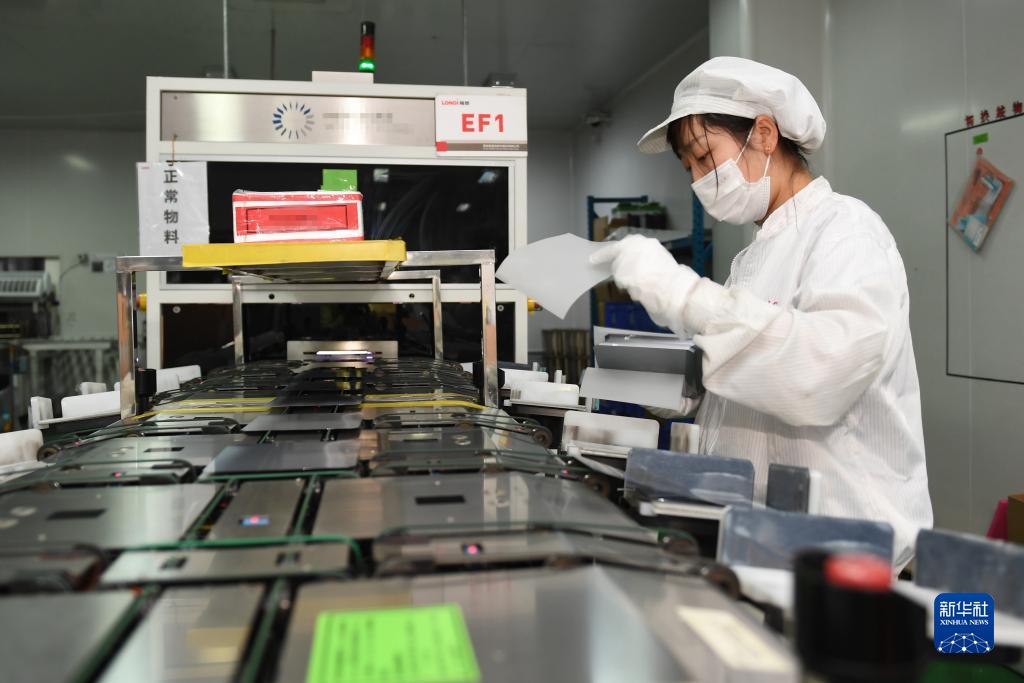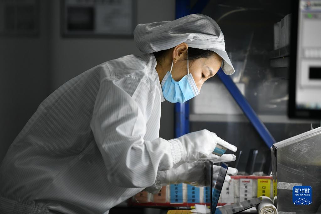 1月18日,在隆基綠能科技股份有限公司西安切片工廠,工人在進(jìn)行檢測(cè)包裝作業(yè)。新華社記者 李一博 攝