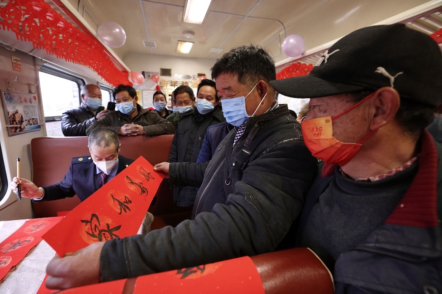 “各位老鄉(xiāng),早上好,今天是農(nóng)歷小年,我們將舉行送祝?;顒印?rdquo;列車員衛(wèi)進忠的話音剛落,就看見車廂里老鄉(xiāng)們急忙圍攏過來。他把寫好的春聯(lián)送給身邊背著背簍的一位老人,將一張福字貼在了背簍上。拿到對聯(lián)、福字的老人滿臉笑容,連忙道謝。“火車快開, 別讓我等待,火車快開,請你趕快送我到遠方家鄉(xiāng)……”在與旅客互動中,列車員李愛民激情演唱歌曲《火車快開》,送去列車工作人員的新春祝福,引來旅客們陣陣掌聲。