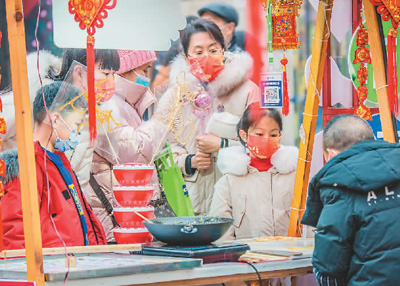 2021年,湖北省經(jīng)濟(jì)增速領(lǐng)跑全國,成績亮眼。圖為春節(jié)期間,游客在武漢武昌楚河漢街觀看糖畫。趙廣亮攝(人民視覺)