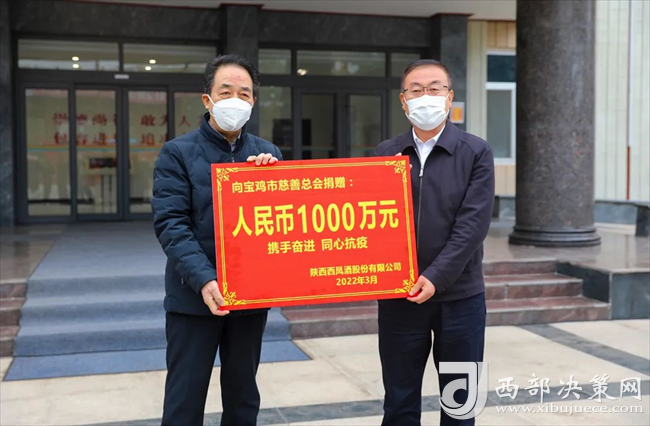 西部決策網(wǎng)訊(韓宗憲 通訊員 羅金)3月18日,陜西西鳳酒股份有限公司向?qū)氹u市慈善總會捐贈1000萬元,支持全市抗疫工作。寶雞市慈善總會常務(wù)副會長牟林樂,西鳳集團(tuán)公司黨委書記、董事長、股份公司董事長張正以及公司班子成員、部分職工代表參加了捐贈儀式。寶雞市慈善總會副會長兼秘書長李海珠主持儀式。