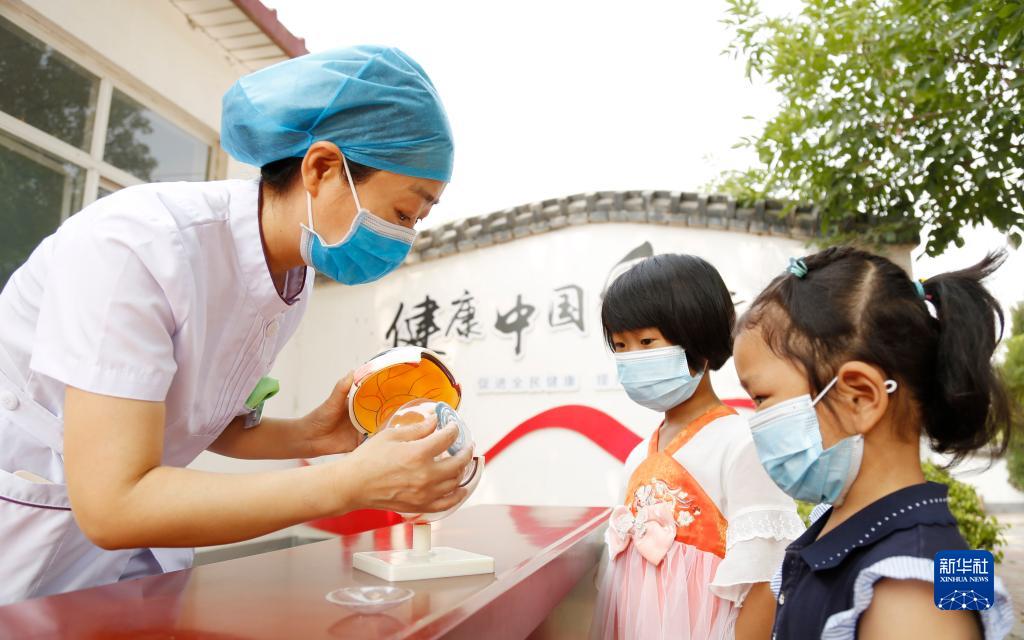 6月5日,河北省邢臺市南和區(qū)人民醫(yī)院醫(yī)務(wù)人員深入鄉(xiāng)村開展基層義診活動,為賈宋鎮(zhèn)蘇史張村小朋友講解眼睛的結(jié)構(gòu)和功能。新華社發(fā)(張馳 攝)