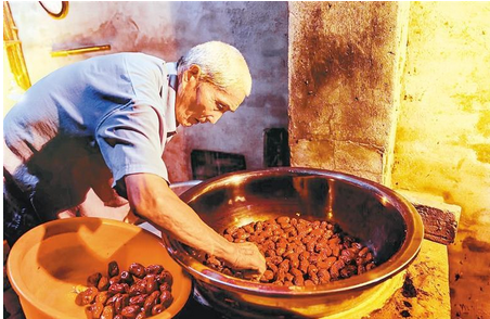 丁健榮亳無保留地講述了他制作甑糕的傳統(tǒng)工藝:甑糕原料是江米、大棗,其比例為每鍋江米10公斤,大棗3公斤,蒸制的每個(gè)步驟都有嚴(yán)格要求。第一步,選優(yōu)質(zhì)江米浸泡在清水里5個(gè)小時(shí)左右,紅棗、蜜棗浸泡2小時(shí)后備用;第二步,江米浸泡好后,用笊籬把江米撈出瀝水,倒入鋪好的篩子里再次瀝水;第三步,江米瀝干水后上蒸鍋燒1個(gè)小時(shí)把米撈出來滲水(適宜即可);第四步,先在鍋底鋪一層棗和蜜棗,再鋪一層米,共鋪三層;第五步,蓋好鍋,用調(diào)好的面糊涂在鍋的四周封閉;第六步,點(diǎn)火燒一個(gè)半小時(shí),上氣后改為小火(鍋底不能斷火);第七步,第二天清晨5時(shí)加熱燒半小時(shí)關(guān)火開蓋。經(jīng)過這一系列程序加工后,熱氣騰騰的紅棗江米香味撲鼻而來,傳統(tǒng)甑糕就大功告成了。