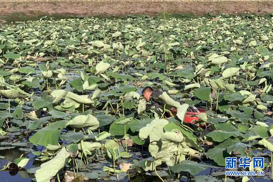 圖為洪湖市黃家口鎮(zhèn)新永林村的藕農正在采收藕帶。新華網發(fā)(受訪者提供)