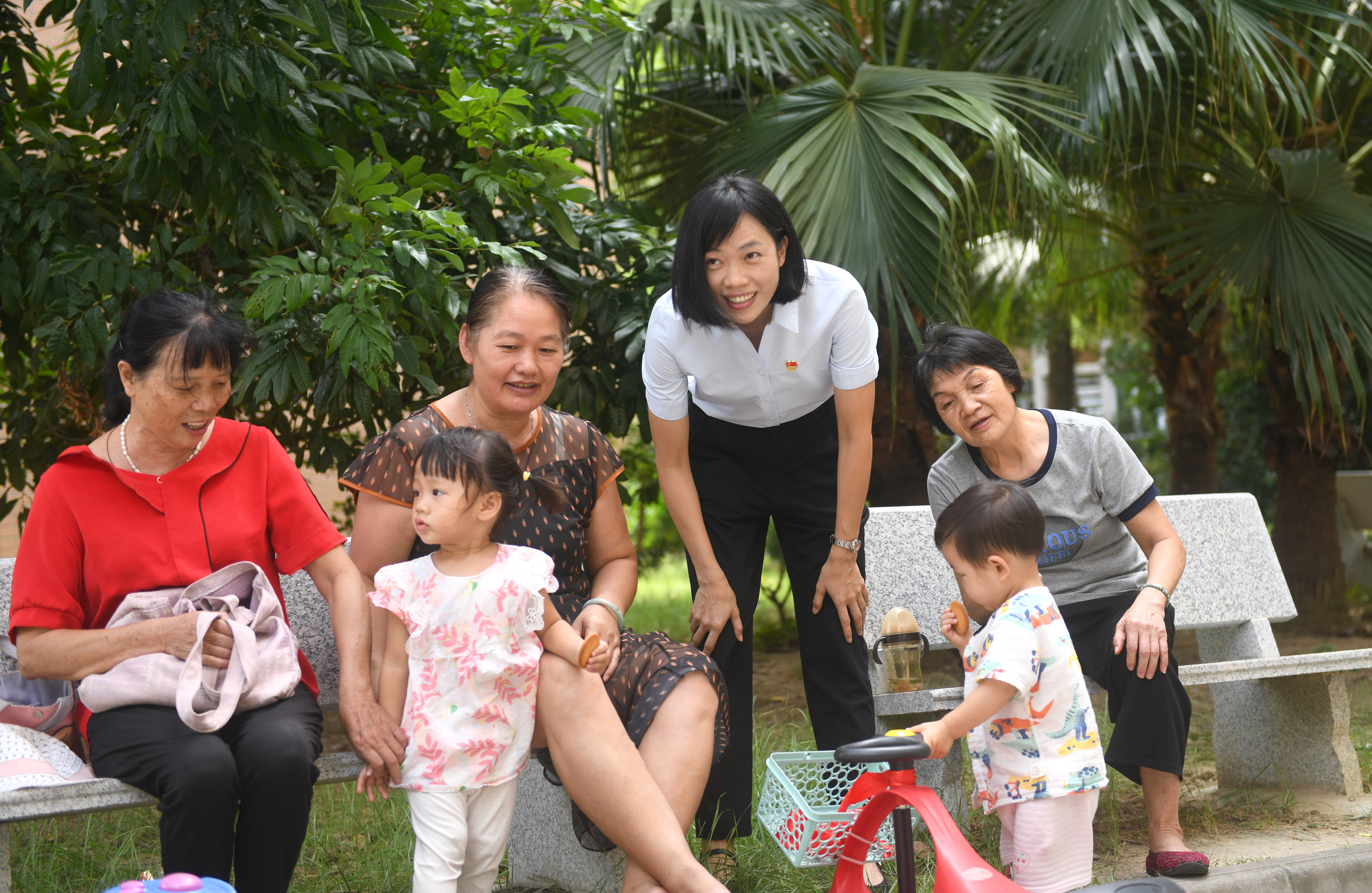 二十大代表、廣東省佛山市禪城區(qū)古灶村黨委書記、村委會(huì)主任陸秀興(右三)和村民在一起聊天(2022年9月7日攝)。新華社記者 盧漢欣 攝