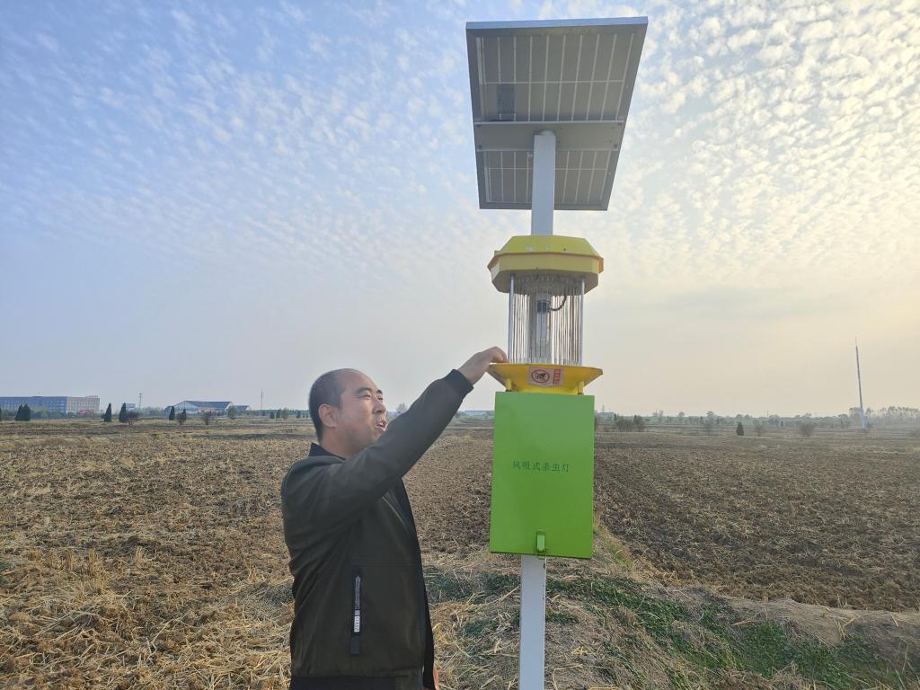 閆大明正在介紹風吸式殺蟲燈。新華社記者 姜剛 攝