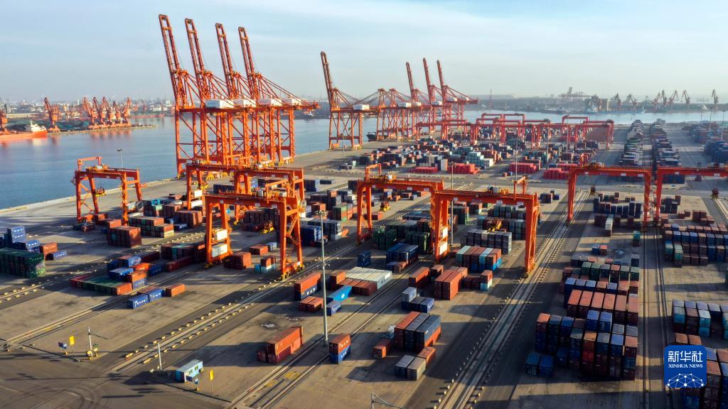 12月7日拍攝的唐山港京唐港區(qū)集裝箱碼頭一角(無人機(jī)照片)。新華社發(fā)(李磊 攝)