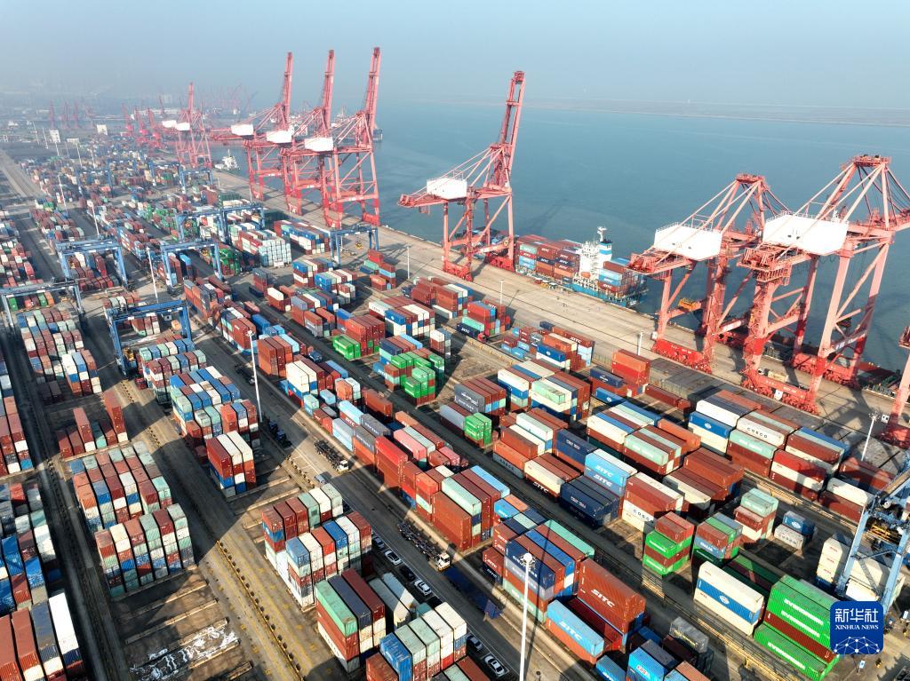 12月7日拍攝的江蘇連云港港集裝箱碼頭裝卸作業(yè)區(qū)(無人機(jī)照片)。新華社發(fā)(王春 攝)