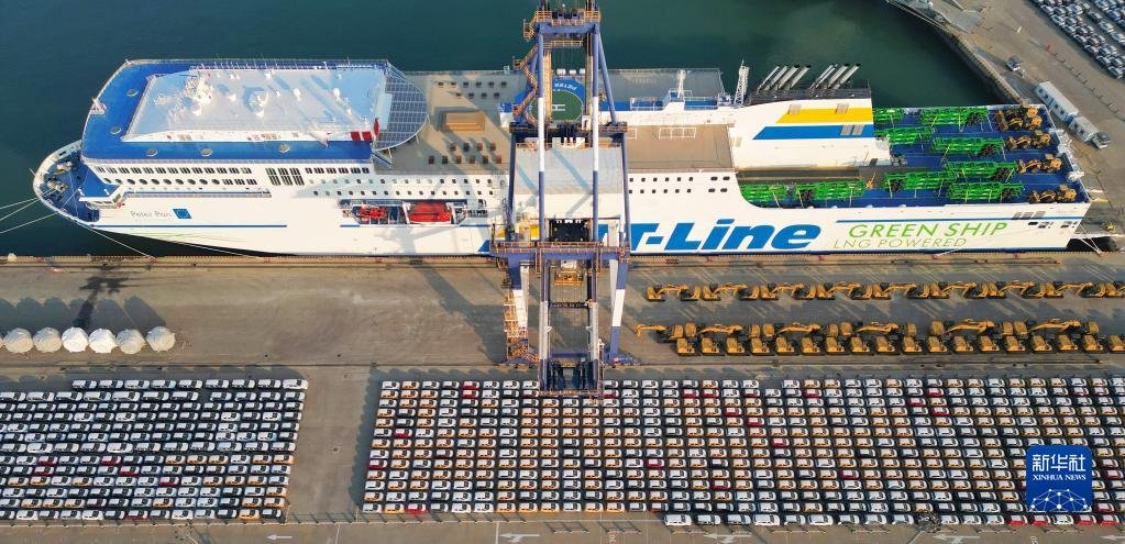 12月7日,出口商品車在山東港口煙臺港集結(jié)裝船(無人機(jī)照片)。新華社發(fā)(唐克 攝)