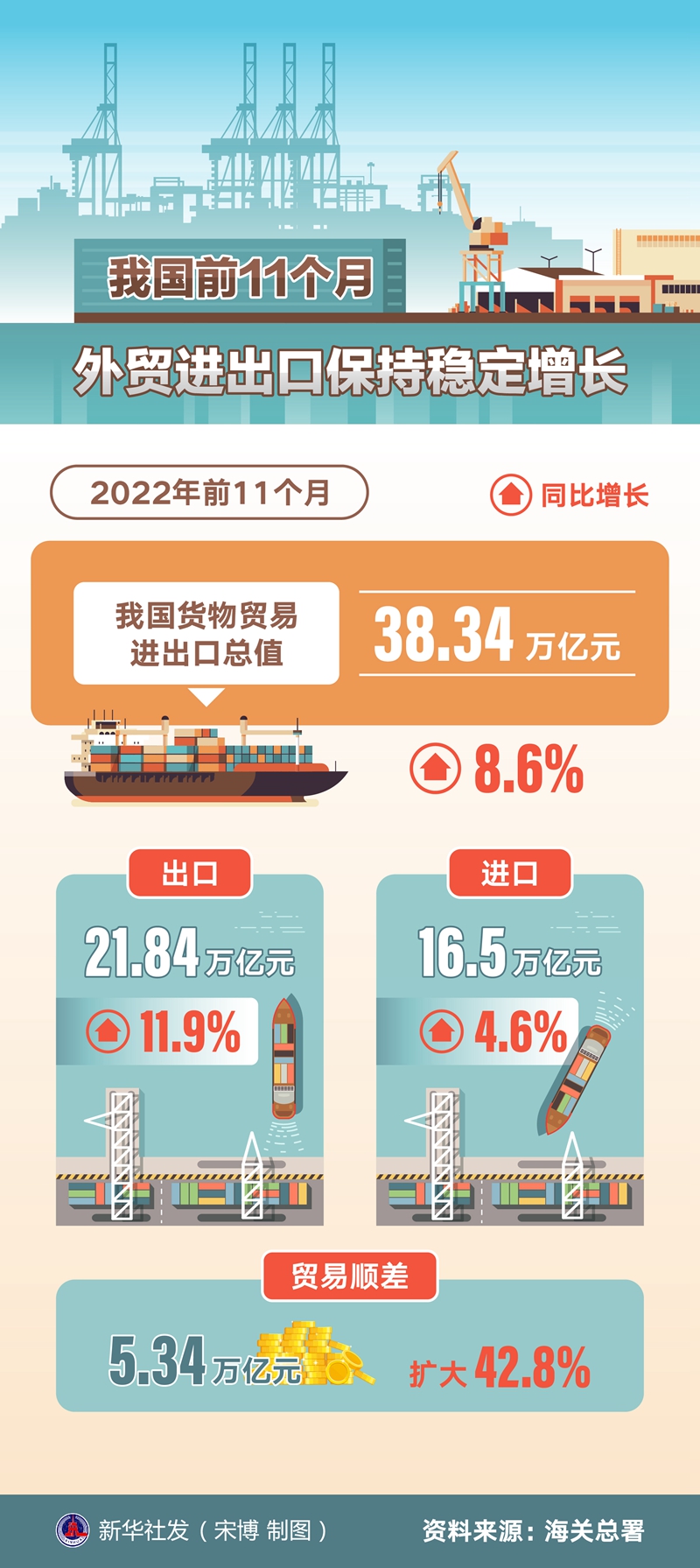 海關(guān)總署7日發(fā)布數(shù)據(jù):今年前11個月,我國貨物貿(mào)易進(jìn)出口總值38.34萬億元,同比增長8.6%。其中,出口21.84萬億元,增長11.9%;進(jìn)口16.5萬億元,增長4.6%;貿(mào)易順差5.34萬億元,擴(kuò)大42.8%。
