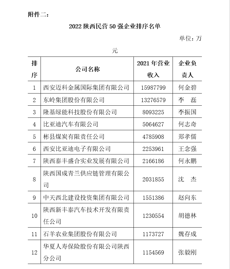 西部決策網(wǎng)訊 12月18日,陜西省企業(yè)家協(xié)會發(fā)布了2022陜西100強企業(yè)和2022陜西民營50強企業(yè)榜單。(具體名單見附件一、二)