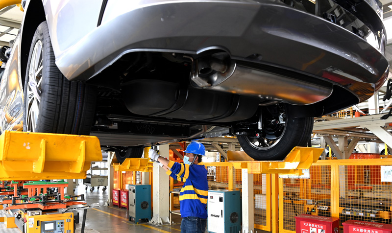 △工作人員在新能源汽車廠進(jìn)行裝配(4月20日攝)。