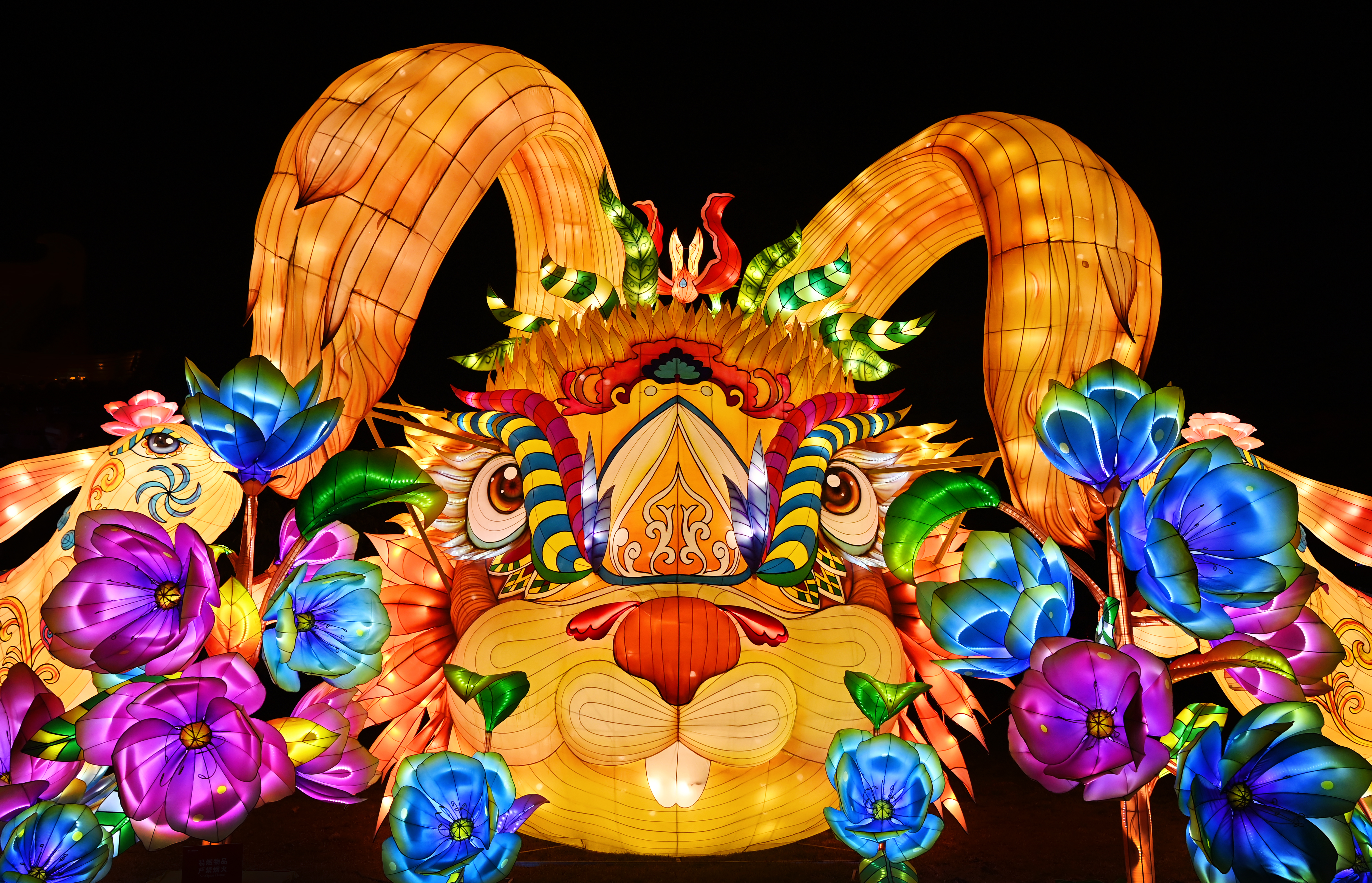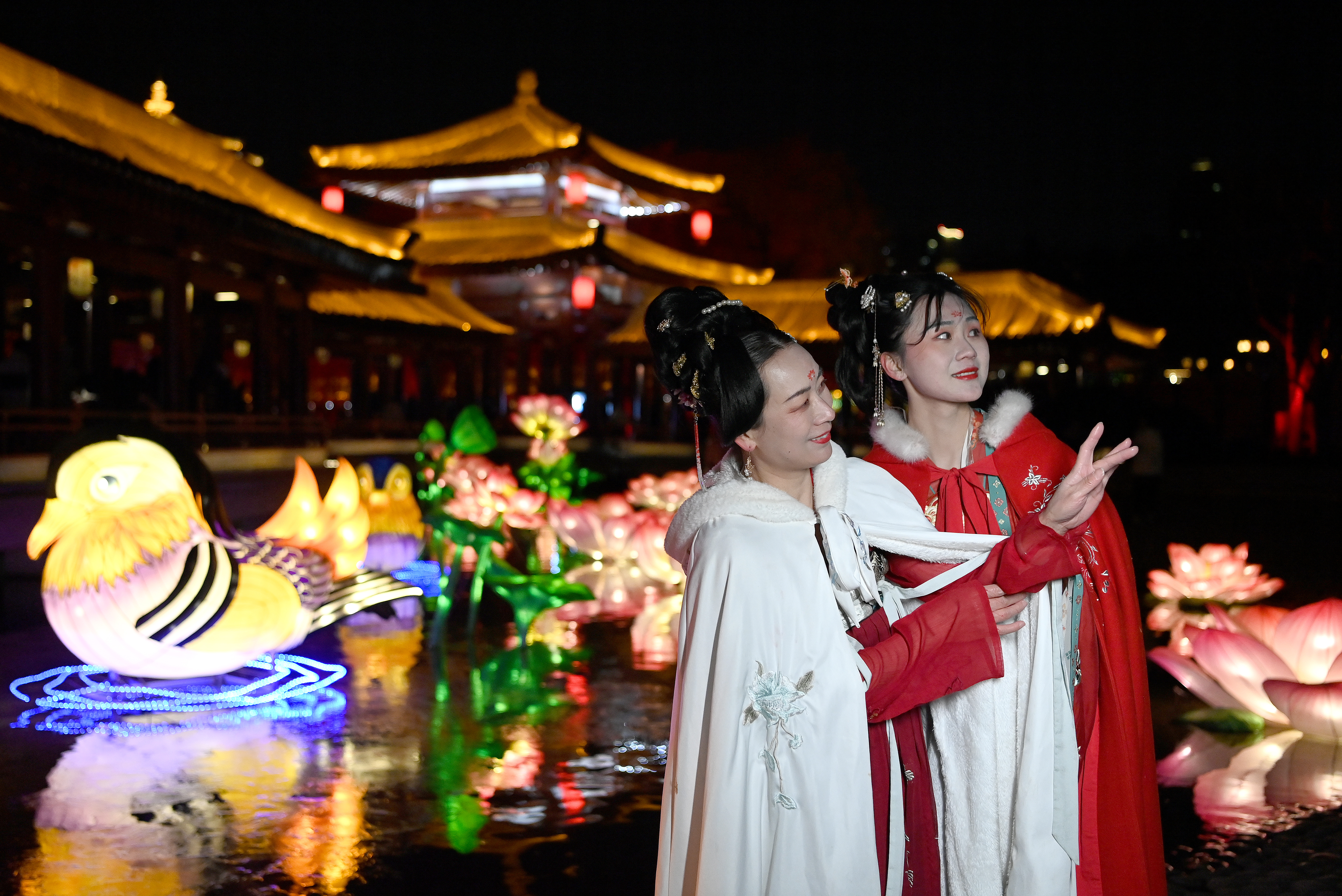夜幕降臨,西安大唐芙蓉園內(nèi)萬盞花燈璀璨綻放,在仿唐式園林的亭臺樓閣、廊橋水波之間,燈與景交相輝映,美輪美奐。