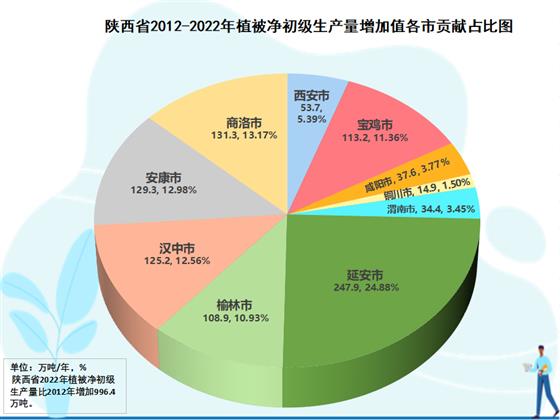2012-2022年分市元生產(chǎn)量增長貢獻(xiàn)分析結(jié)果表明,各市對全省生態(tài)蛋糕增長均有所貢獻(xiàn),但各市的貢獻(xiàn)大小差異很大,在生態(tài)蛋糕中的地位也隨之有所變化。全國退耕還林策源地美稱的延安是全省生態(tài)蛋糕增量最大的市,10年增加247.9萬噸,為全省生態(tài)蛋糕增加量貢獻(xiàn)了24.9個百分點。商洛第二,10年增加131.3萬噸,為全省貢獻(xiàn)13.2個百分點。安康第三,10年增加129.3萬噸,為全省貢獻(xiàn)13.0個百分點。漢中第四,增加125.2萬噸,為全省貢獻(xiàn)12.6個百分點。其后,依次分別是寶雞增加113.2萬噸、為全省貢獻(xiàn)11.4%,榆林增加108.9萬噸、為全省貢獻(xiàn)10.9%,西安增加53.7萬噸、為全省貢獻(xiàn)5.4%,咸陽增加37.6萬噸、為全省貢獻(xiàn)3.8%,渭南增加34.4萬噸、為全省貢獻(xiàn)3.4%,銅川增加24.9萬噸、為全省貢獻(xiàn)1.5%。