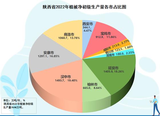 全省元生產(chǎn)力區(qū)域分析結(jié)果表明,在三大區(qū)域生態(tài)蛋糕越來越大的同時,生態(tài)蛋糕的空間布局上與結(jié)構(gòu)發(fā)生變化,呈現(xiàn)黃河流域綠色崛起大趨勢。陜北榆林、延安兩市,生態(tài)空間8971.6萬畝,占全省的39.6%;關(guān)中西安、寶雞、咸陽、渭南、銅川五市生態(tài)空間4554.5萬畝,占全省的29.2%;陜南漢中、安康、商洛三市生態(tài)空間9136.2萬畝,占全省的40.2%。2022年,陜北兩市提供了2070.9萬噸植被凈初級生產(chǎn)量,占全省的26.9%,比2012年的1714.1萬噸增加313.8萬噸,增長18.3%,在全省份額上升了1.3個百分點;關(guān)中五市提供了1775.1萬噸的植被凈初級生產(chǎn)量,占全省的23.1%,比2012年的1524.3萬噸250.8萬噸,增長16.4%,在全省份額上升了0.3個百分點;陜南三市提供了3851.5萬噸植被凈初級生產(chǎn)量,占全省的50.0%,比2012年的3462.7萬噸增加388.8萬噸,增長11.2%,在全省份額下降了1.6個百分點。2012-2022年全省新增生態(tài)蛋糕996.4萬噸,陜北兩市貢獻(xiàn)31.5%,關(guān)中五市貢獻(xiàn)29.5%,陜南三市貢獻(xiàn)39.0%。陜北、關(guān)中提供的生態(tài)蛋糕占全省的份額已由2012年的48.4%提高到2022年的50.0%。