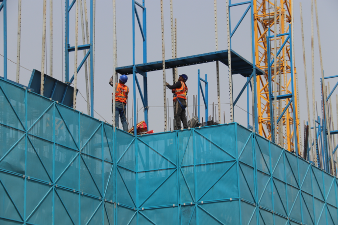 工人正在進(jìn)行附著式升降腳手架安裝