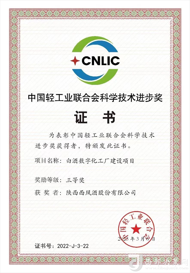 西部決策網(wǎng)訊(記者劉玉 韓宗憲 通訊員吳婷蘭 馬迪)近日,中國(guó)輕工業(yè)聯(lián)合會(huì)五屆三次、中華全國(guó)手工業(yè)合作總社八屆三次理事會(huì)在福建廈門召開。會(huì)議宣讀了《2022年度中國(guó)輕工聯(lián)合會(huì)科技獎(jiǎng)決定》并舉行了頒獎(jiǎng)儀式,陜西西鳳酒股份有限公司申報(bào)的“白酒數(shù)字化工廠建設(shè)項(xiàng)目”榮獲科學(xué)技術(shù)進(jìn)步三等獎(jiǎng)。