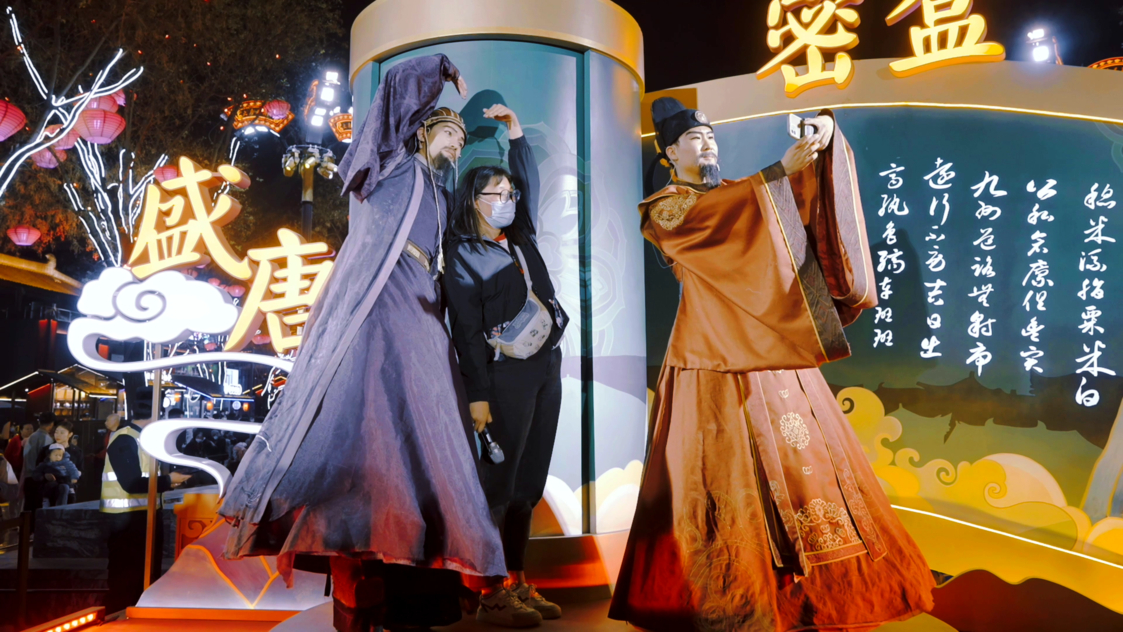 “《西游記》中九九八十一難,第一難是什么?”“不知道,不要緊,來,拍個照。”夜色漸濃,西安市大雁塔下的大唐不夜城華燈熠熠,流光溢彩。兩位身著古裝的演員,分別扮演唐代名人房玄齡和杜如晦,出題與游客進(jìn)行互動,幽默風(fēng)趣的提問和回答引得臺下觀眾不時發(fā)出陣陣歡笑。