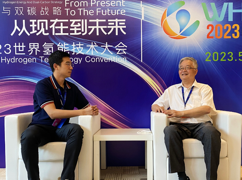 圖為國際氫能協(xié)會副主席毛宗強(右)接受新華網(wǎng)采訪