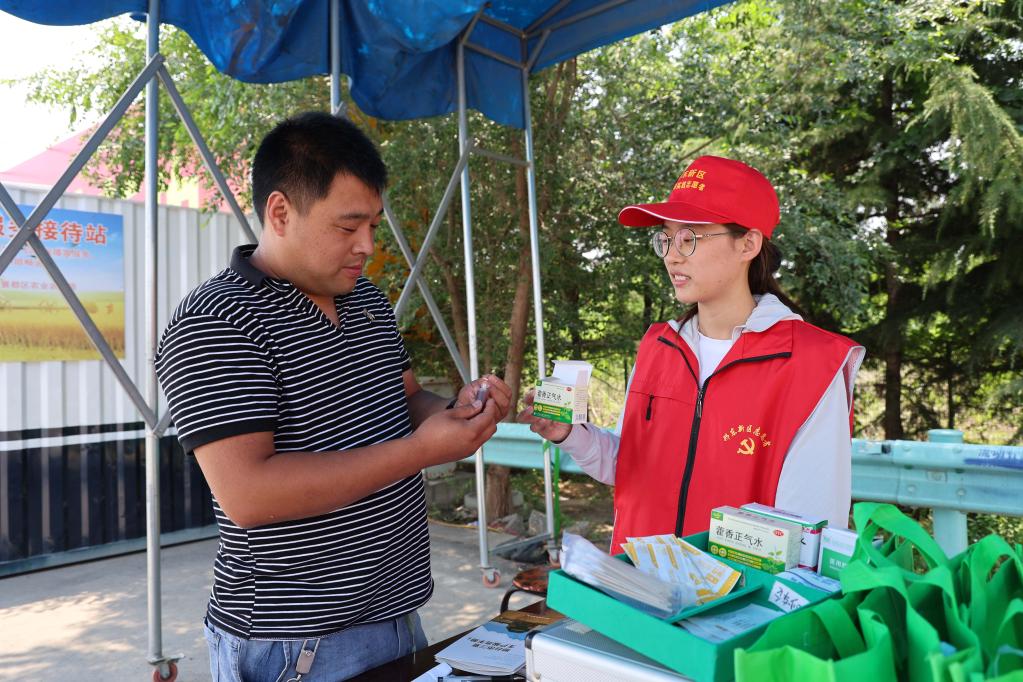 在G4京港澳高速邢臺北口,跨區(qū)機(jī)收接待服務(wù)站工作人員向農(nóng)機(jī)手發(fā)放防暑物品。新華社記者 鄒尚伯 攝