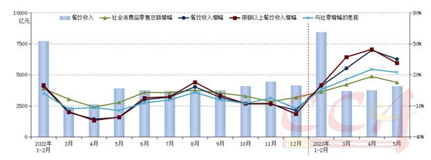 中國(guó)烹飪協(xié)會(huì)結(jié)合往年數(shù)據(jù)分析指出,2023年5月份全國(guó)餐飲收入、限上餐飲收入增速較去年同期上升56.2個(gè)、52.2個(gè)百分點(diǎn)。1-5月,全國(guó)餐飲收入、限上餐飲收入增速較去年同期上升31.1個(gè)、34.5個(gè)百分點(diǎn),餐飲收入占社會(huì)消費(fèi)品零售總額的10.6%。