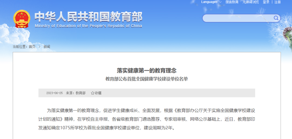 記者6月25日從教育部獲悉,為落實(shí)健康第一的教育理念,促進(jìn)學(xué)生健康成長(zhǎng)、全面發(fā)展,在學(xué)校自主申報(bào)、各省級(jí)教育部門(mén)遴選推薦、專(zhuān)家組審核、網(wǎng)絡(luò)公示基礎(chǔ)上,教育部近日印發(fā)通知,確定1075所學(xué)校為首批全國(guó)健康學(xué)校建設(shè)單位,建設(shè)周期為2年。