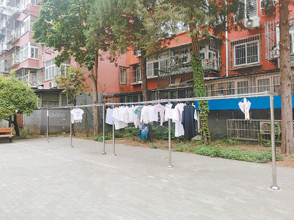 走出古城南路社區(qū)東門,沿古城東街北行400余米右轉(zhuǎn)進(jìn)入八角北路社區(qū),只見幾株高大的國(guó)槐及道邊的綠藤錯(cuò)落有致。再向里走,是一塊寬闊的活動(dòng)場(chǎng)地,北側(cè)建有一排不銹鋼晾衣架,架上晾滿了衣服。“有居民提出家里陽臺(tái)上晾衣服不方便,我們特地尋找合適地方,為這些社區(qū)建了晾衣架。”北京石房物業(yè)有限公司(以下簡(jiǎn)稱石房物業(yè))副經(jīng)理孫偉說。