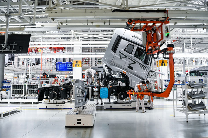 在位于吉林長(zhǎng)春的一汽解放汽車(chē)有限公司J7智能工廠(chǎng)內(nèi),工人在A(yíng)GV(搬運(yùn)機(jī)器人)上裝配車(chē)輛(2023年6月12日攝)。新華社記者 顏麟蘊(yùn) 攝