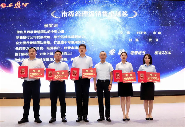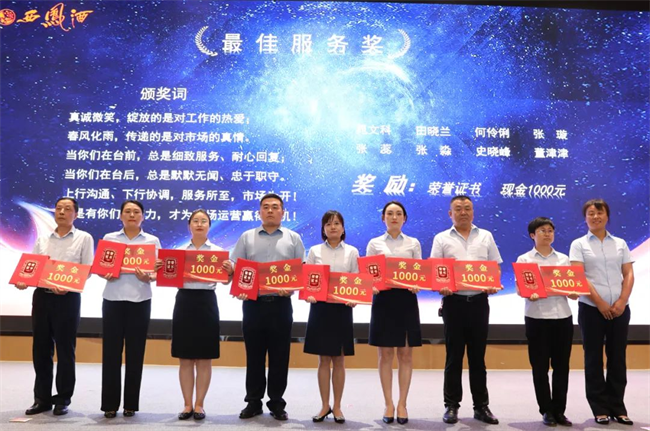 西鳳股份公司總經(jīng)理助理趙永紅為市級經(jīng)理銷售卓越獎獲得者頒發(fā)榮譽證書與獎金