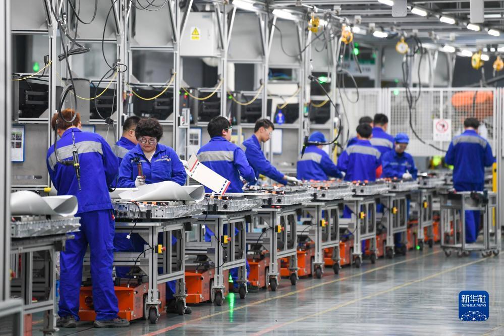 在特斯拉上海超級(jí)工廠,工人在車間內(nèi)忙碌(2月27日攝)。新華社記者 周蕊 攝