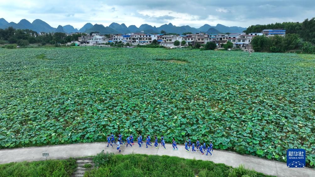 8月7日傍晚,孩子們在荷塘邊跑步鍛煉體能(無人機(jī)照片)。