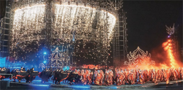 四川省涼山彝族自治州西昌市火把廣場舉辦的第八屆涼山彝族火把節(jié)開幕式活動(dòng)現(xiàn)場,演員們載歌載舞,為游客獻(xiàn)上精彩演出。