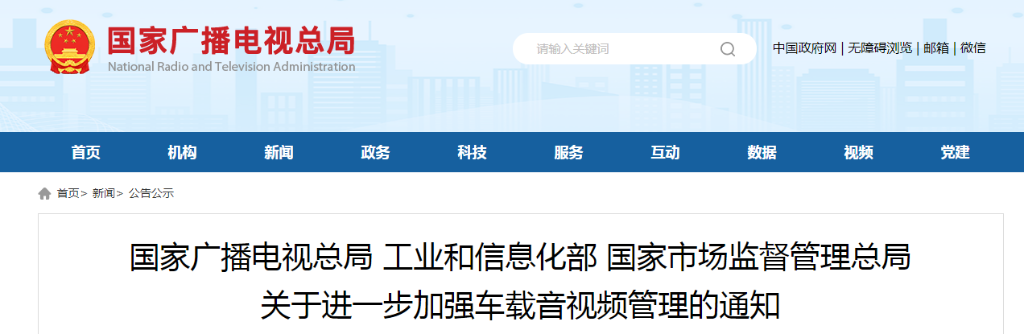 三部門發(fā)布通知要求進一步加強車載音視頻管理