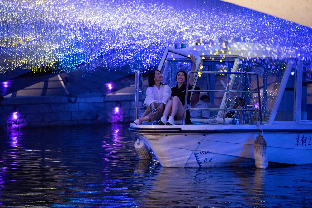 這是人們乘坐北京亮馬河游船經(jīng)過被裝點(diǎn)成“星空”的好運(yùn)橋。 新華社記者 陳鐘昊 攝