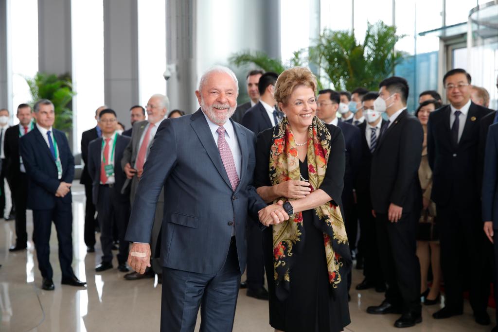 4月13日,巴西總統(tǒng)盧拉在新開發(fā)銀行總部與新開發(fā)銀行新任行長(zhǎng)、巴西前總統(tǒng)羅塞夫女士親切握手。(新華社記者高峰攝)