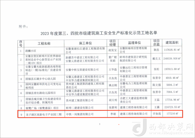 近日,安徽省蚌埠市建筑管理處下發(fā)2023年度第三、四批市級建筑施工安全生產(chǎn)標(biāo)準(zhǔn)化示范工地名單,公司龍子湖區(qū)高新電子產(chǎn)業(yè)園三期EPC項(xiàng)目欣然在列。