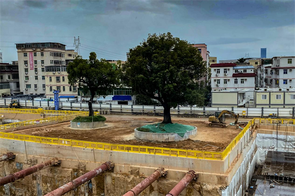 中鐵一局承擔的深(圳機場)大(亞灣)城際鐵路白坭坑站總長約540米,總建筑面積為53957平方米,為地下兩層、局部三層雙島五線車站。白坭坑站地面的2株三級古樟樹,位于車站中部上方,也是規(guī)劃18號線換乘節(jié)點東側;兩樹相距約16米,其中1株樹齡116年,高14.5米,胸圍3.3米,平均冠幅12.3米;另一株樹齡106年,高15.7米,胸圍2.2米,平均冠幅10.3米。