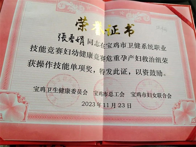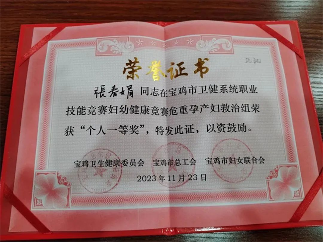 鳳翔區(qū)醫(yī)院產(chǎn)科醫(yī)生張春娟代表鳳翔區(qū)衛(wèi)健系統(tǒng)參加危重孕產(chǎn)婦救治、危重新生兒救治等項(xiàng)目競(jìng)賽。在比賽中,張春娟沉著發(fā)揮,認(rèn)真應(yīng)對(duì),憑借扎實(shí)的理論基礎(chǔ)、嫻熟的操作技能,最終榮獲危重孕產(chǎn)婦救治個(gè)人一等獎(jiǎng)、危重孕產(chǎn)婦救治技能操作單項(xiàng)獎(jiǎng)等殊榮。