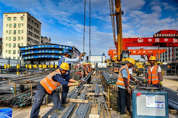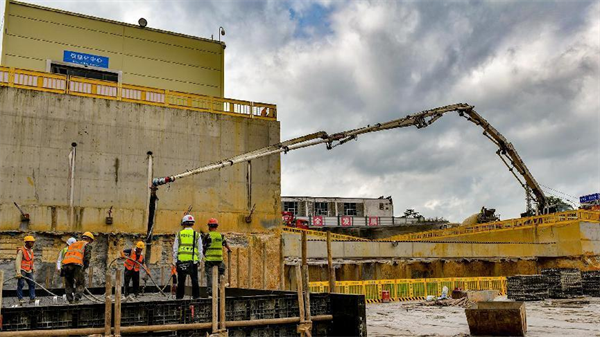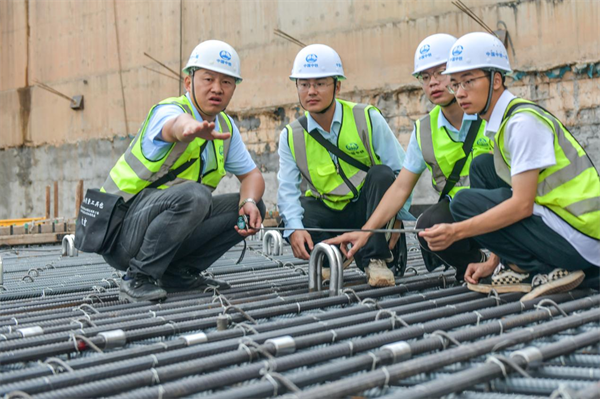照此安排,項(xiàng)目部各部門、作業(yè)隊(duì)既各自為戰(zhàn),又協(xié)調(diào)統(tǒng)一,按區(qū)域、分專業(yè)、依先后齊頭并進(jìn)。筆者在地面施工區(qū)域看到,盾構(gòu)井臨時(shí)封堵板的鋼筋綁扎已經(jīng)完成,8名作業(yè)人員和監(jiān)理、技術(shù)人員在做最后的檢查,混凝土罐車、泵車嚴(yán)陣以待……不一會(huì)兒,混凝土順著管子就流向了鋼筋網(wǎng)內(nèi),4名振搗工也隨之開始忙碌,嗡嗡聲響成一片。車站1號鋼筋場,10幾名穿著印有“鋼筋工”“信號司索工”馬甲的工人,或協(xié)助吊車調(diào)運(yùn)鋼筋、或切割鋼筋原材下料;不遠(yuǎn)處,吊車調(diào)運(yùn)明挖段鋼支撐轉(zhuǎn)場……