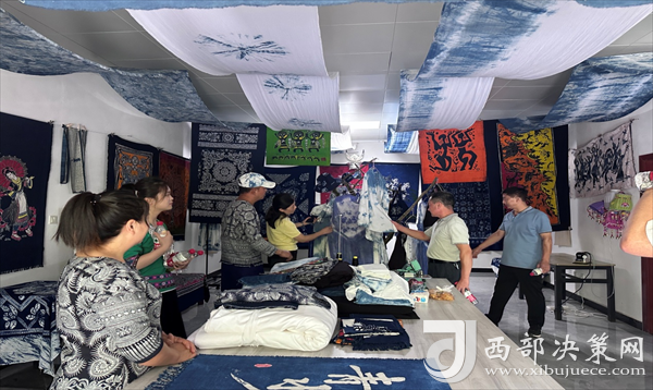蠟染,古稱蠟纈,與絞纈、夾纈并稱為我國古代三大印花技藝。在朱家?guī)X村的蠟染坊,只見蠟染非遺傳承人楊兵用銅刀刃蘸蠟,畫出各種圖案花紋,畫好的蠟片放在藍靛染缸里浸泡數(shù)次,沸水煮去蠟質(zhì),待完成時便是栩栩如生的圖案。該鎮(zhèn)作為西北最北的苗鄉(xiāng),近年來,積極探索推廣“非遺+”、“非遺工坊”等模式,將蠟染、苗繡等非遺技藝與旅游相結(jié)合,通過游客親身體驗非遺蠟染、刺繡文創(chuàng)凝練的非遺技藝精髓,將傳統(tǒng)文化符號與時尚元素有機結(jié)合,打造出既具有時尚氣息又不失文物獨特魅力與內(nèi)涵的服裝、飾品等文創(chuàng)產(chǎn)品。持續(xù)將“指尖技藝”轉(zhuǎn)化為“經(jīng)濟效益”。近年來,該鎮(zhèn)在守護好、傳承好、展示好苗族優(yōu)秀文化成果上下功夫。挖掘新鄉(xiāng)賢文化潤富潛力,讓“非遺”文化在創(chuàng)新性發(fā)展中不斷“火起來”“潮起來”,實現(xiàn)文化和經(jīng)濟價值的有機統(tǒng)一,展現(xiàn)日新月異的時代氣息和創(chuàng)新活力。